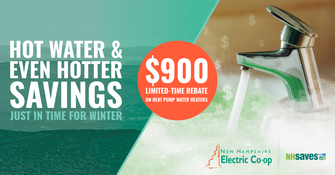 As your NHSaves® utility partner, the Co-op is offering members a limited time $900 rebate through the end of the year on qualifying heat pump water heaters, which makes the upfront cost of installing a heat pump water heater more affordable than ever!